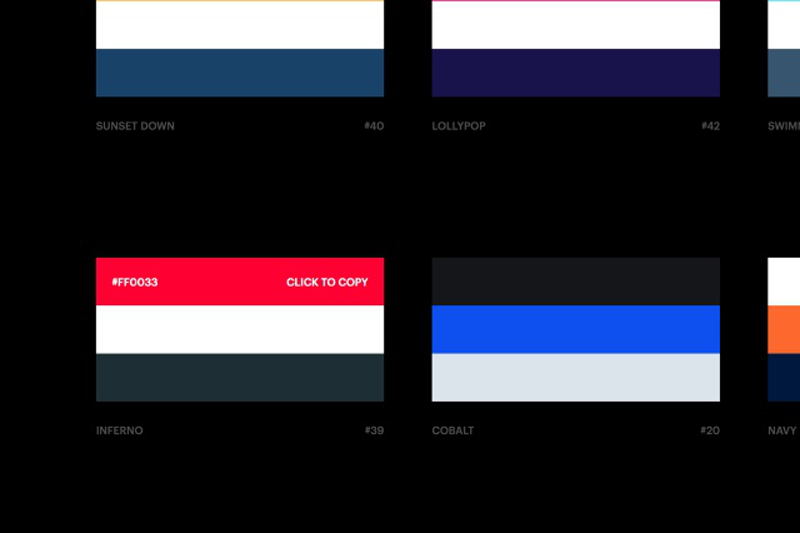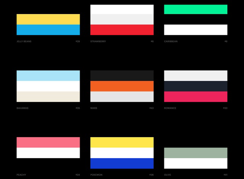 開啟 Colorinspire.io 網(wǎng)站后可以看到各個顏色組合,目前約有45 種,每一個組合都由三種顏色構成,下方還會有配色名稱和編號。