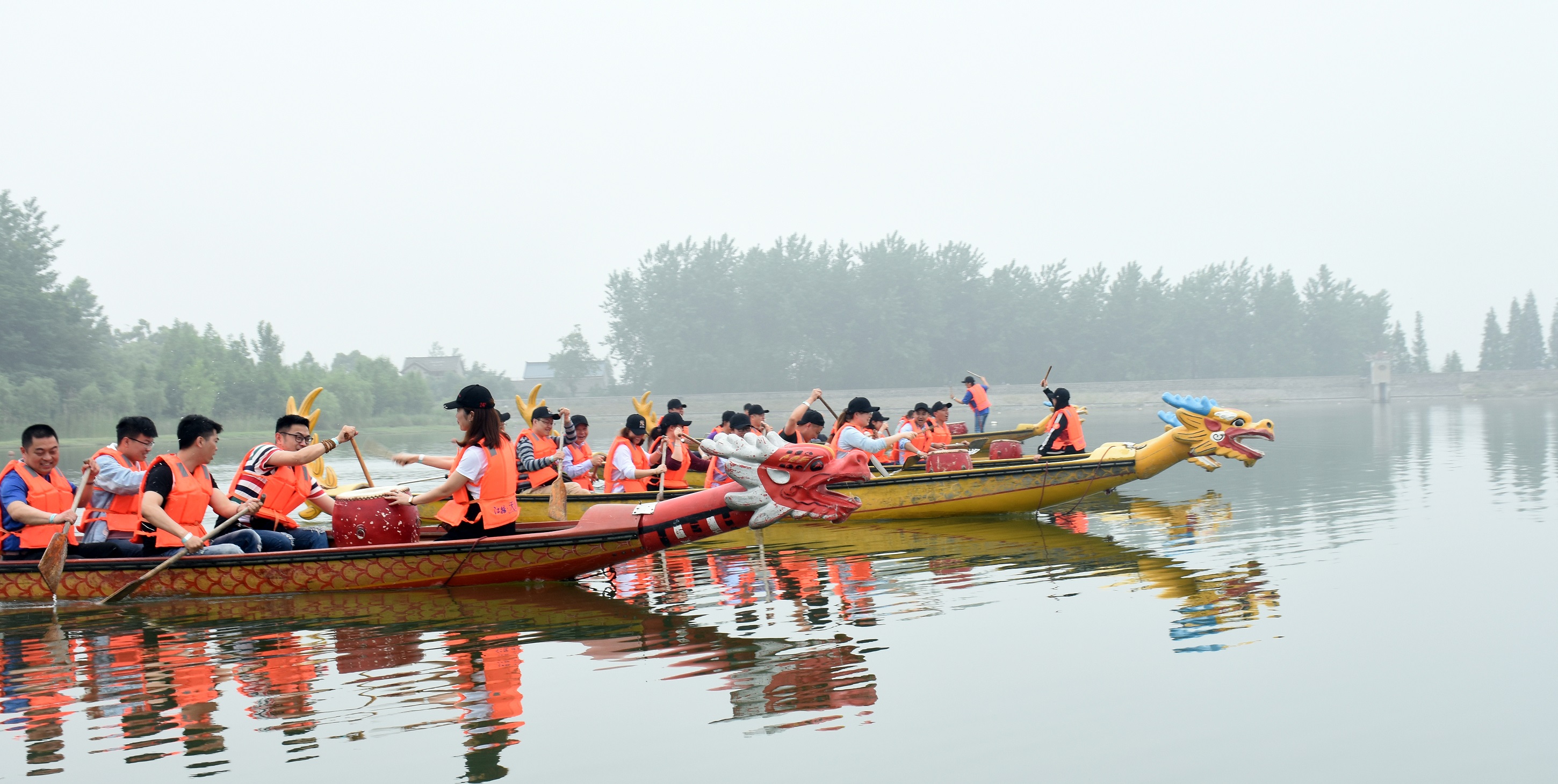 上午首個挑戰(zhàn)活動是劃龍舟比賽。參加人員共分成4個小隊,經(jīng)過簡短的水上練習(xí)后,隨著裁判一聲令響,四條龍舟劈波斬浪,隊員們擼起袖子、甩開膀子、擊鼓號令,揮橈劃槳,近500米的賽道上,大家同舟共濟(jì)、奮勇爭先。