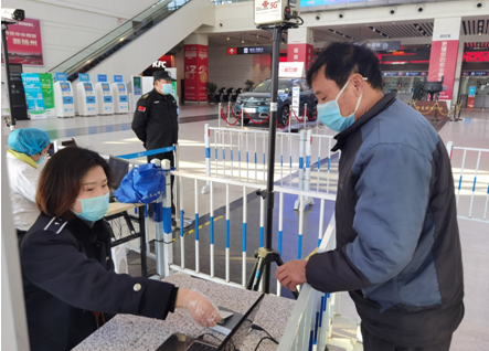 進站口,車站的工作人員嚴格佩戴口罩,手套,正對進站乘車的旅客進行體溫、健康碼、身份證等的檢查。